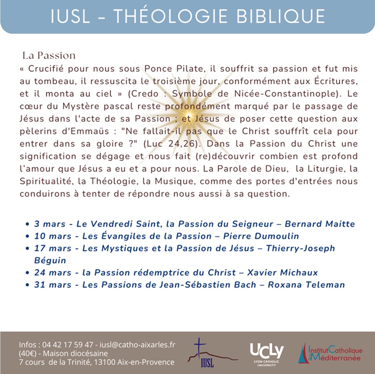 - Studium du Séminaire Saint-Luc : formation des séminaristes au baccalauréat canonique de théologie selon le ratio de la formation des prêtres. Certains cours sont ouverts aux étudiants du DUET et aux auditeurs libres (sur inscription).