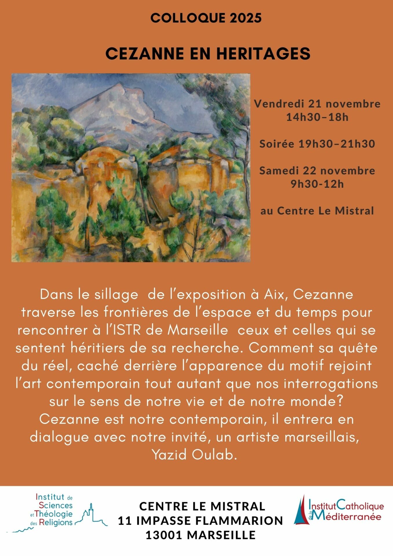 Cezanne est notre contemporain, c’est pourquoi il nous a semblé intéressant de le faire entrer en dialogue avec un artiste marseillais, Yazid Oulab, que nous remercions d’avoir accepté d’entrer notre démarche.
